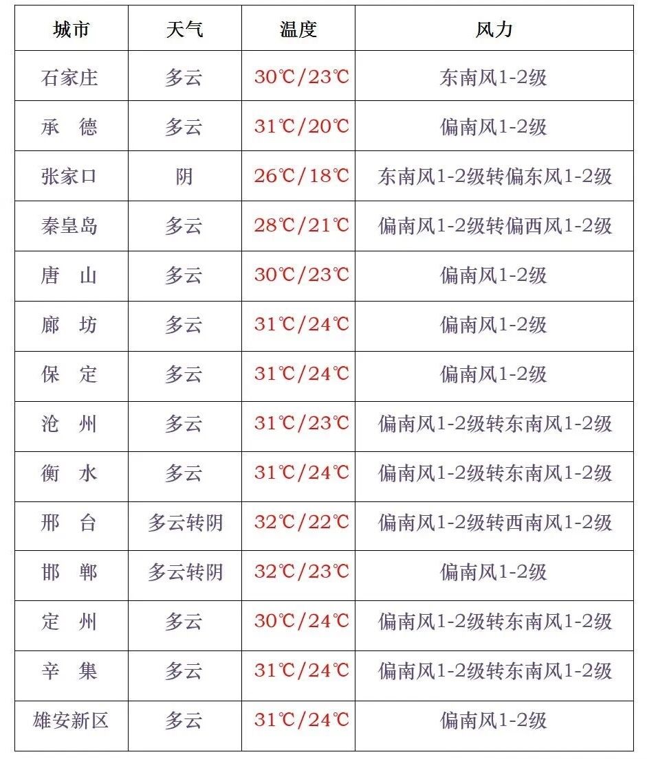 【局地有降水】今天白天,张家口、承德西部、保定西部、石家庄西部多云间阴有分散性雷阵雨或阵雨,雷雨时局地伴有短时强降水、短时大风等强对流天气,其他地区多云间晴。